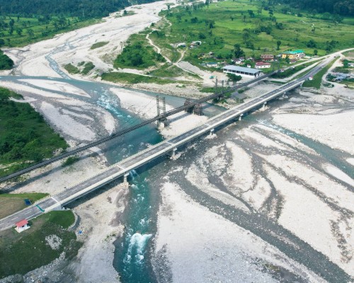 The 280-meter Diana Bridge is a multi-span, prestressed concrete I-girder bridge. It will connect Samtse Dzongkhag headquarters to nine of the Dzongkhag’s gewogs via the Samtse-Tashichholing Secondary National Highway. Designed with a load capacity of 70 tonnes, it replaces a 300-meter Bailey bridge that had been operating at a reduced capacity. The construction of the Diana Bridge was completed 16 months ahead of its original schedule, marking a significant engineering accomplishment for the nation.